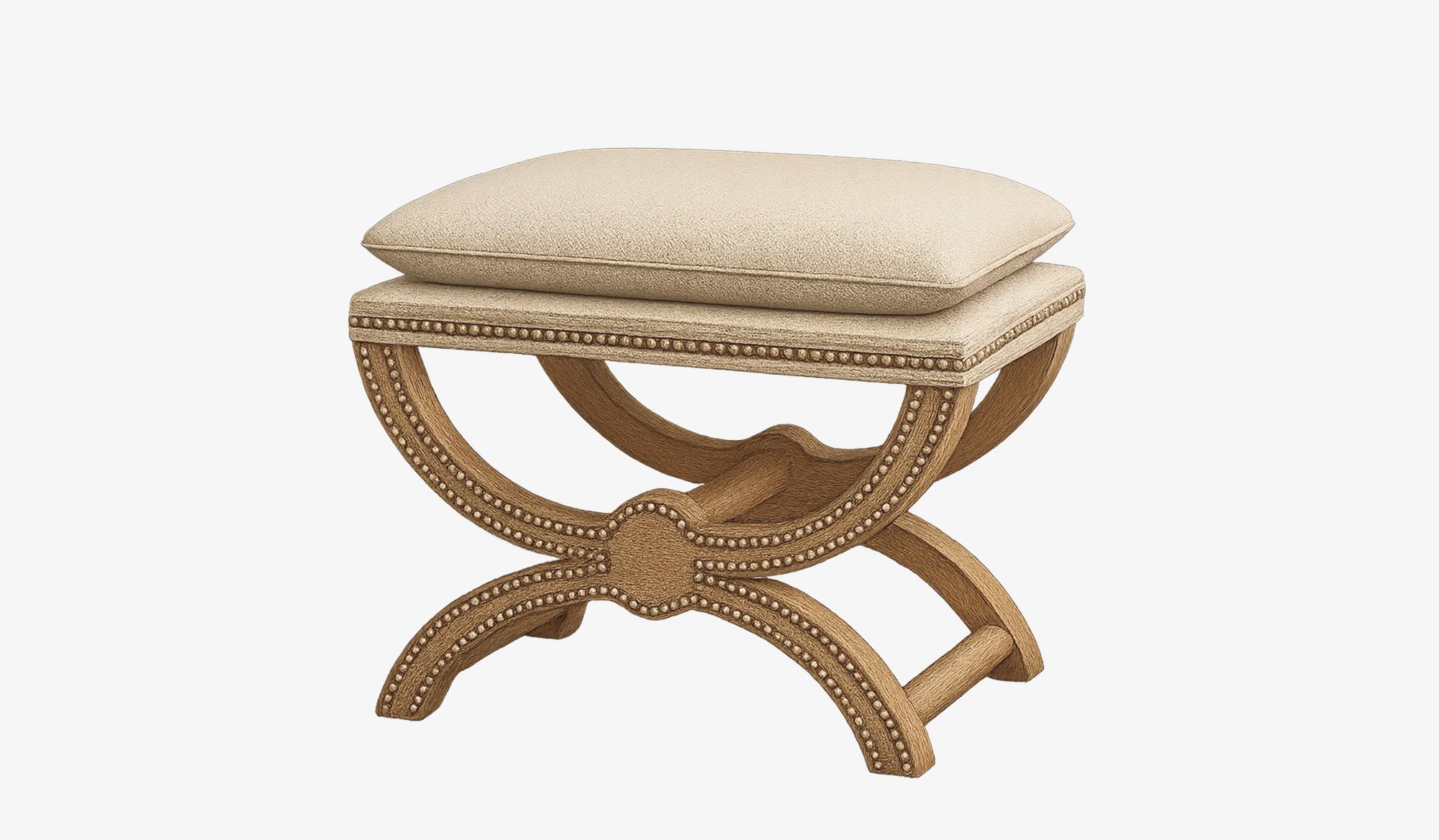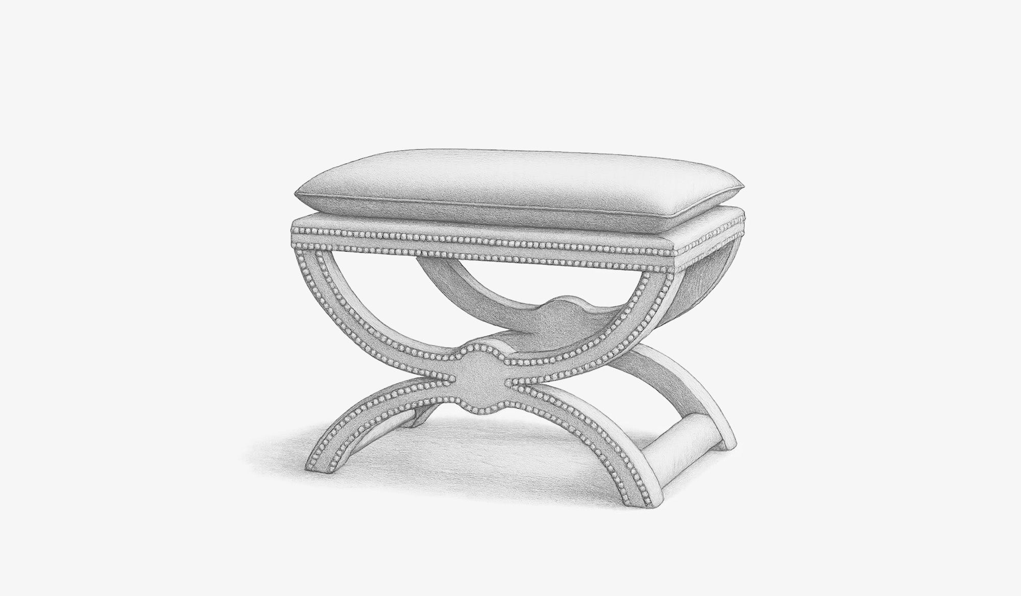 The Crosset Ottoman is defined by its dramatic intersecting base, finished with decorative nailhead trim along every curve. Its tailored pillow-top seat adds a soft, elevated contrast to the architectural foundation—an ideal accent for traditional or transitional interiors.