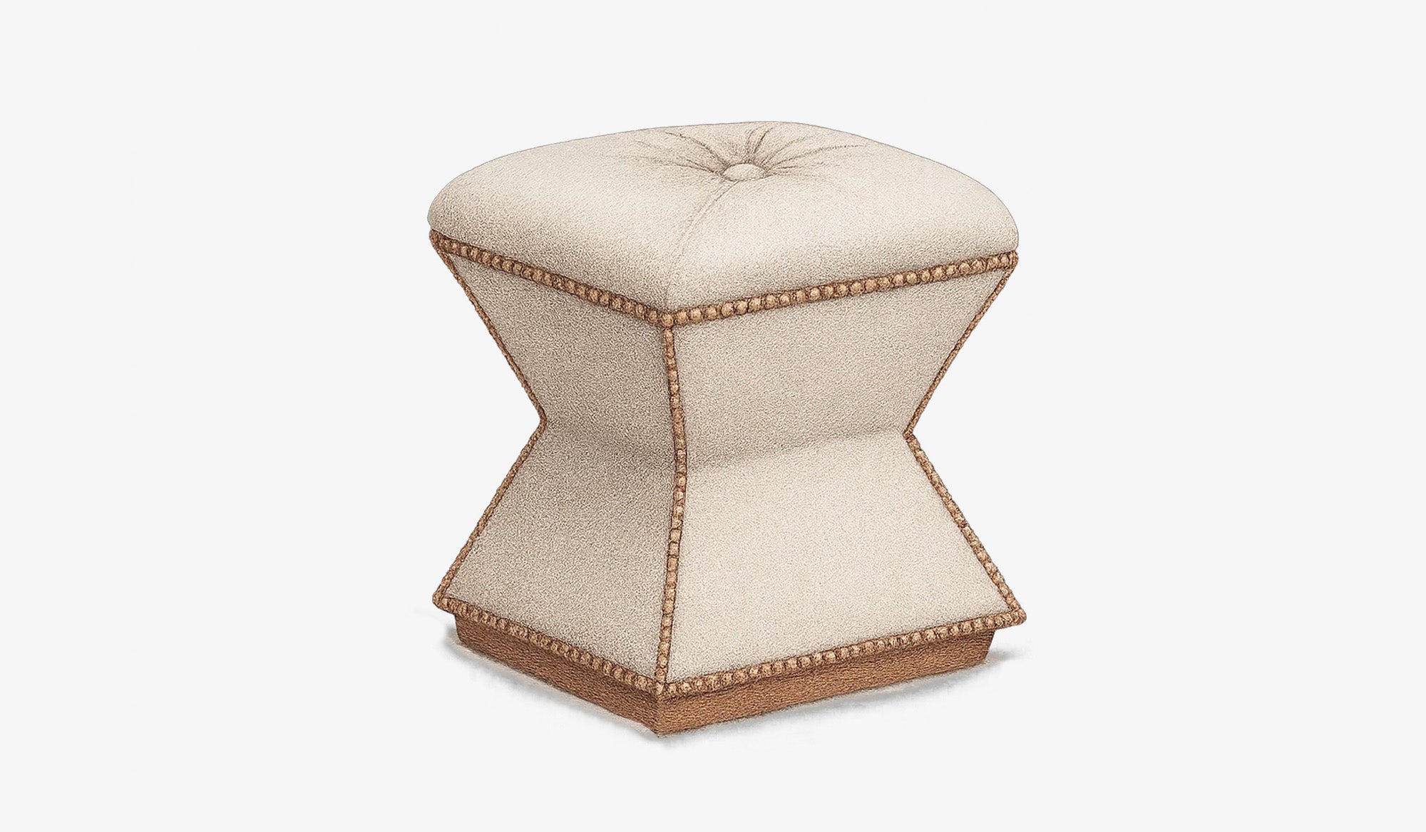 A sculptural ottoman with an hourglass silhouette, crowned by a button-tufted top. Accented with nailhead trim that traces its every curve, the Bijou adds dramatic flair in a compact footprint.