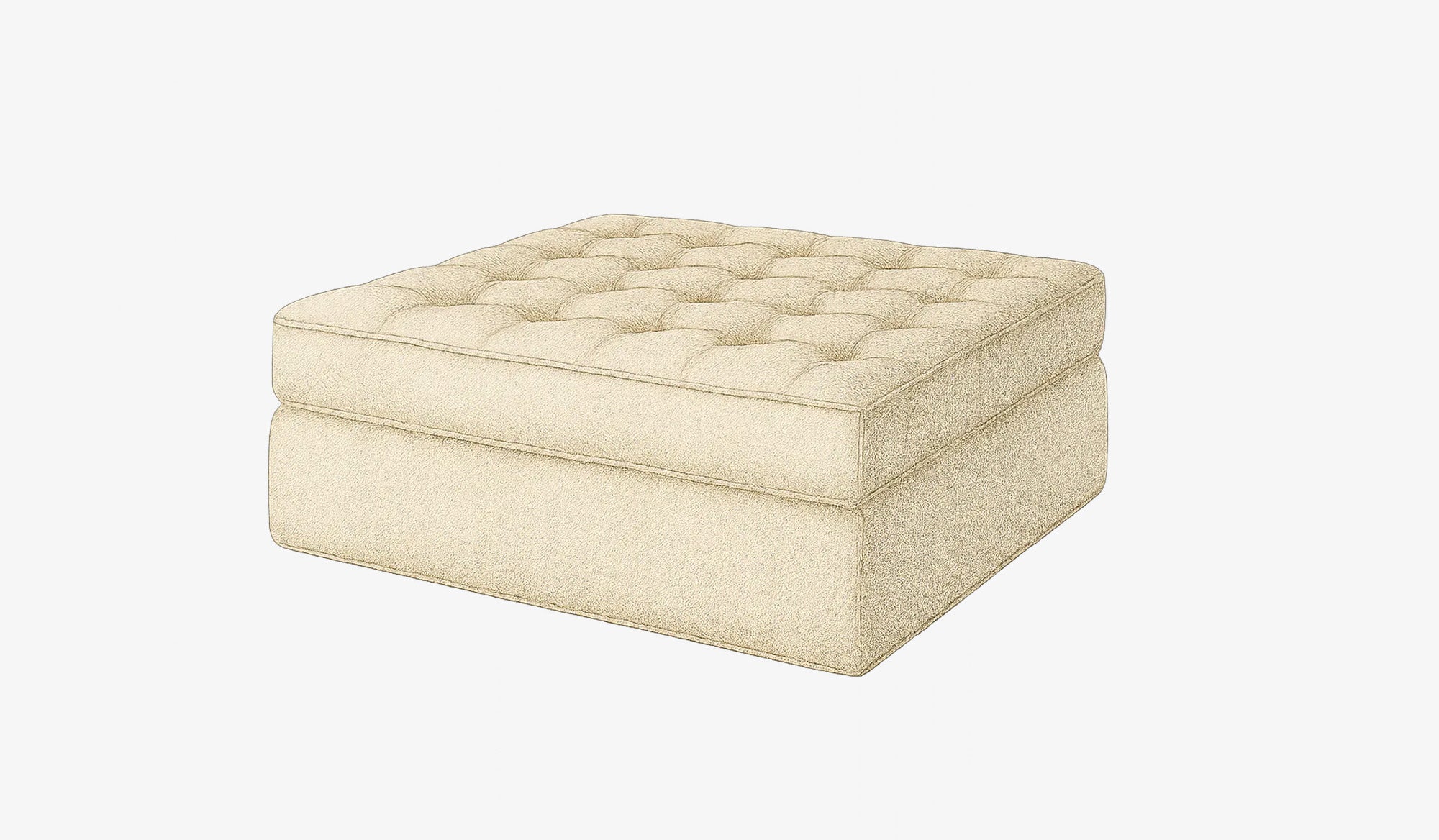 A cocktail ottoman with hand-tufted cushion, seamless box base, and crisp silhouette. The tufting adds dimension and structure, while the scale and softness invite flexible use, whether as a table, bench, or footrest. Quietly bold, effortlessly tailored.