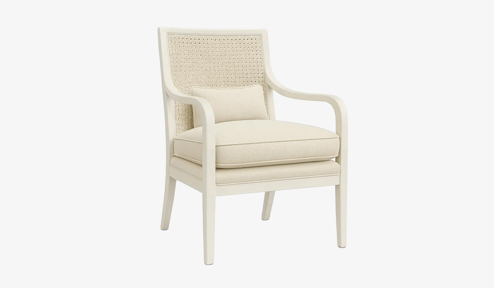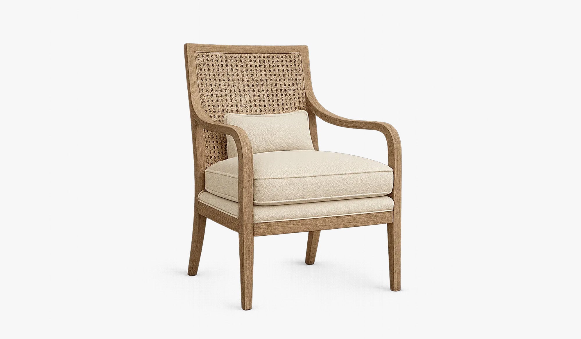 The Amira chair blends structured softness with textural contrast. Carved wood arms sweep into a caned back, offering an airy refinement. There's a quiet charm in its presence—organic, thoughtful, and slightly nostalgic.