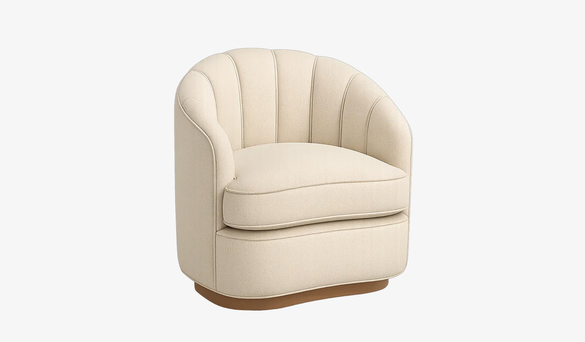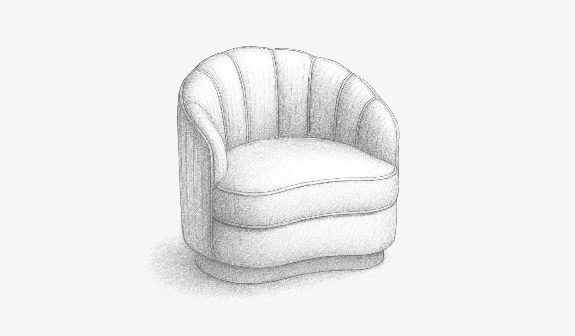 The Le Croissant chair curves around you like a gesture—generous, sculpted, and unbothered by corners. Vertical channels deepen its rhythm, while rounded pedestal feet root the silhouette with playful strength. It’s bold, but not loud.