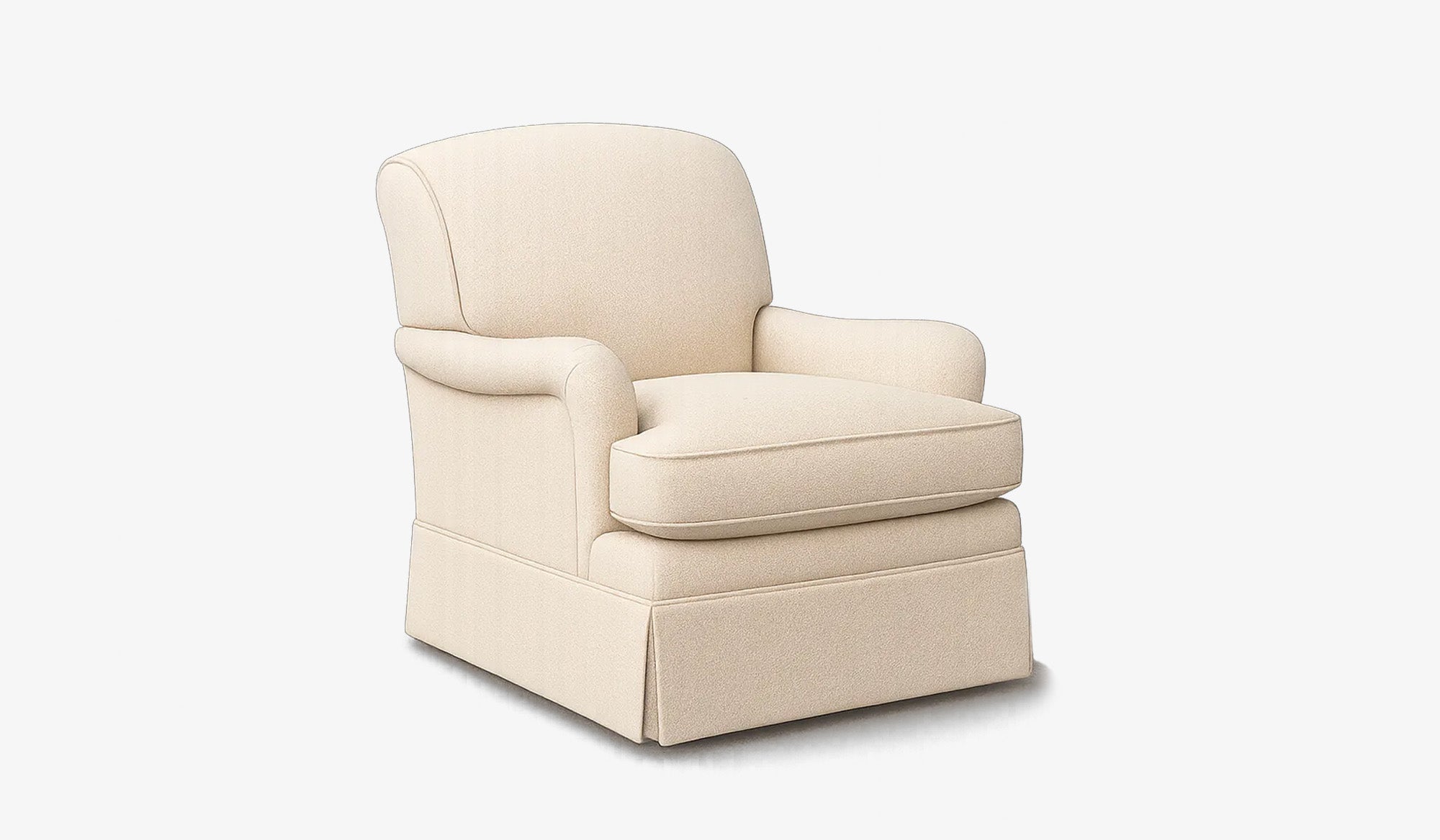 With softly pleated English arms and a clean silhouette, the RIVA Chair balances comfort and classic tailoring. A skirt lends elegance, while the tight back and plush seat cushion provide sink-in support without sacrificing structure. Perfectly scaled for both traditional and transitional spaces.